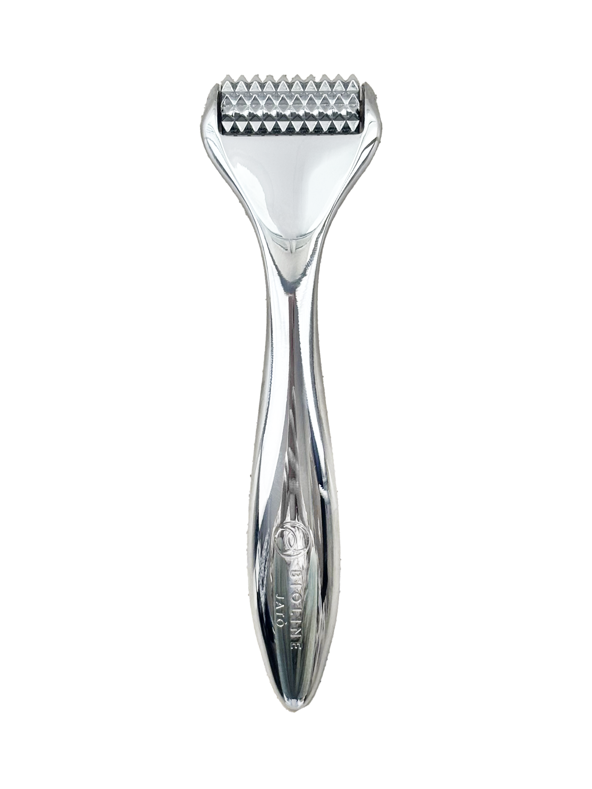 Rulla lodrätt, vågrätt & diagonalt på huden. Du behöver inte trycka hårt då rollern har en tyngd i sig självt!